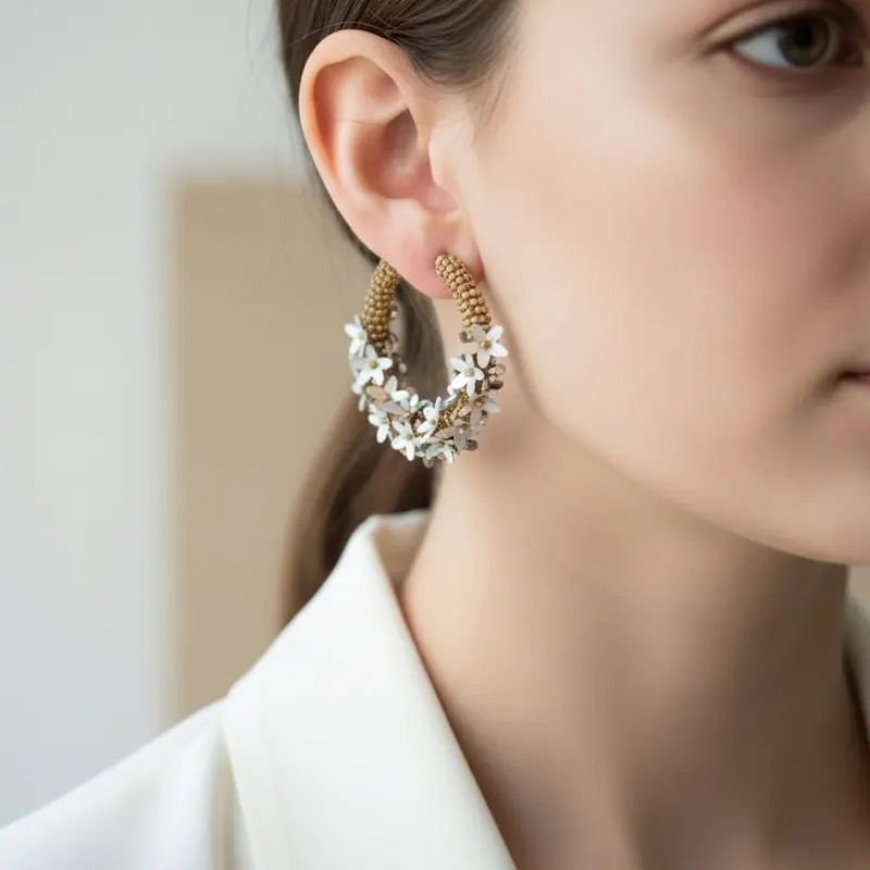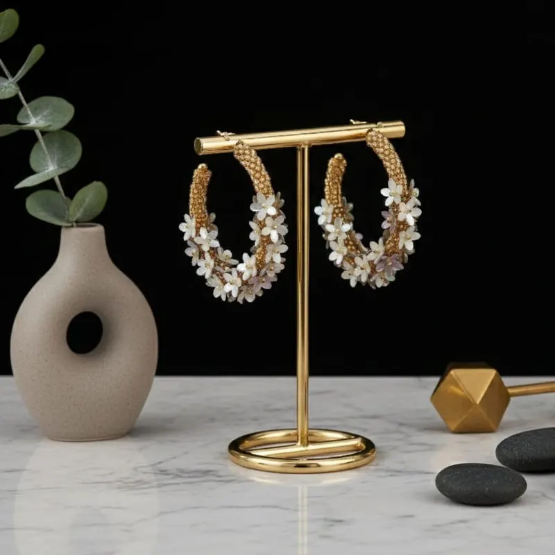 • These floral hoop earrings are designed with tiny white beads arranged in a flower pattern over a gold-toned base. They are generally produced using a gold-plated structure, commonly made from alloy or copper, and decorated with artificial beads, pearls, or crystals. Their design reflects a mix of romantic, vintage, and modern aesthetics, making them appropriate for daily use as well as special events such as weddings or parties.