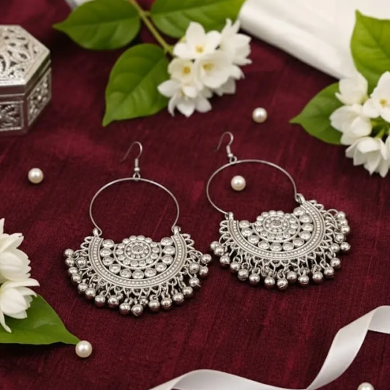 - Style: The earrings shown are silver-toned and incorporate small decorative beads, sometimes referred to as ‘ghungroos’.often worn with traditional Indian attire like sarees and lehengas, though modern styles can be paired with contemporary outfits as well.