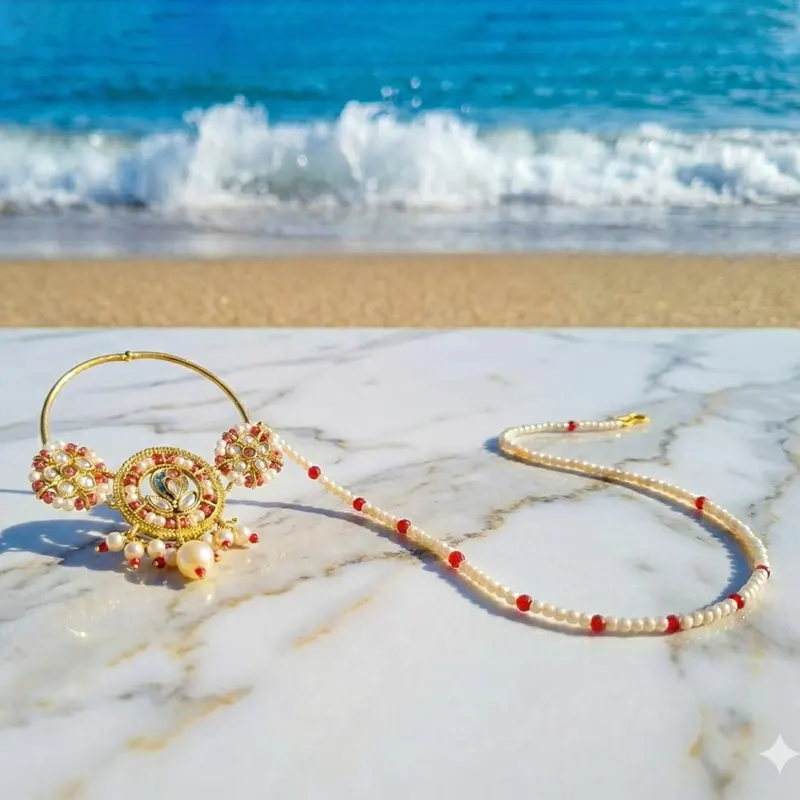 - Inspired by traditional Indian artistry, this nose ring features a delicate gold-tone hoop decorated with intricate red and white bead detailing. The circular centerpiece is highlighted with sparkling stones and finished with pearl danglers that create soft movement and charm. A fine pearl chain with red accents completes the design and adds to its regal appearance.