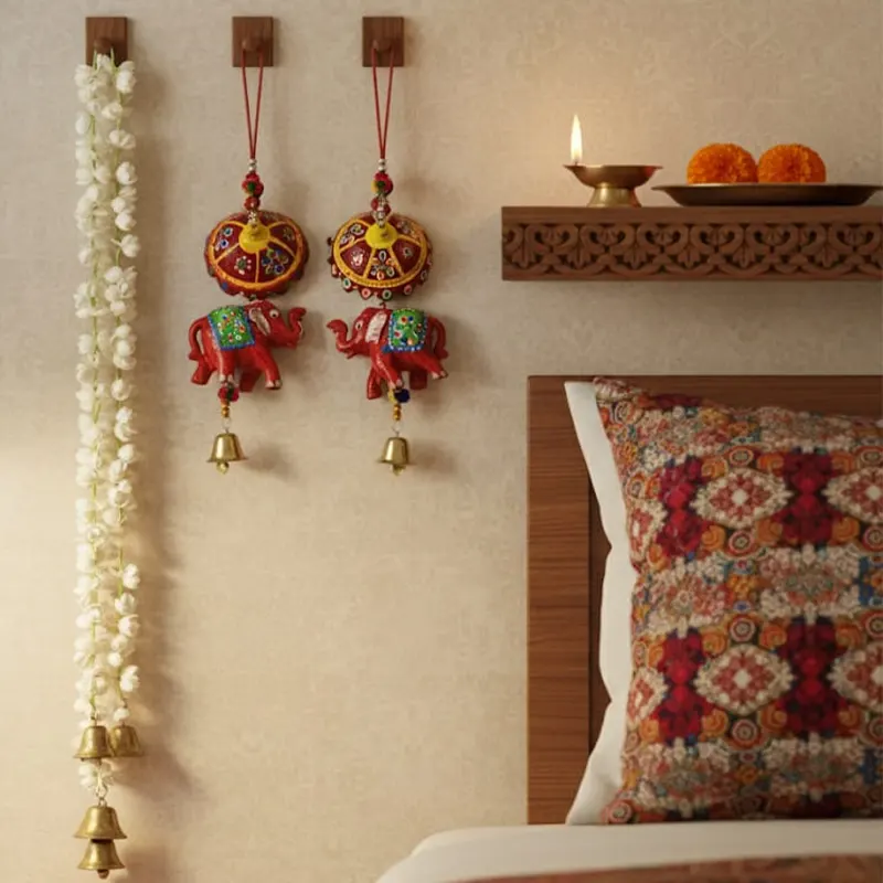 Handcrafted Rajasthani elephant door hanging with umbrella, hand-painted in vibrant colors. Brings positive vibes and auspiciousness to home décor. Ideal for living rooms, entrances, festivals, weddings, and gifting occasions.