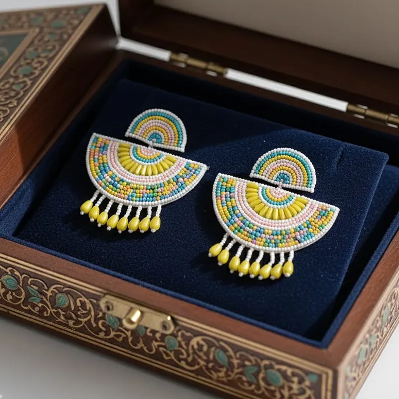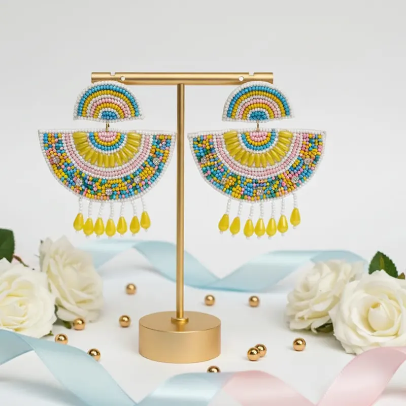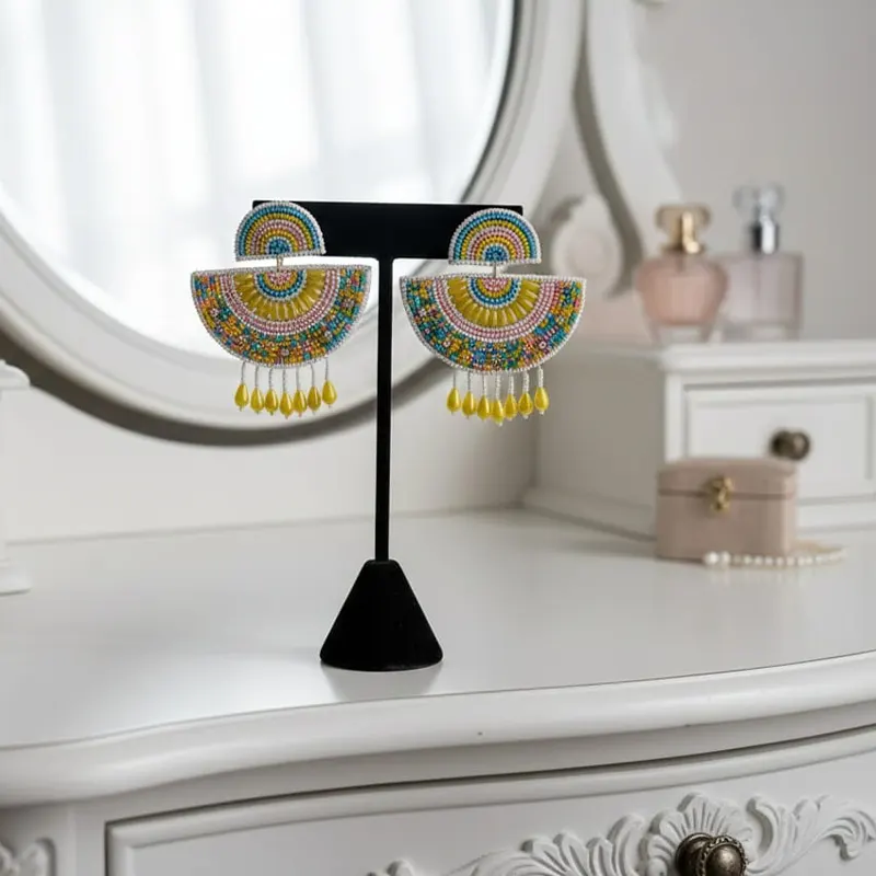 These handmade semicircular drop earrings feature vibrant multicolor beadwork with a tassel fringe in yellow, blue, pink, and white shades. Designed in a bohemian and ethnic style, they are lightweight and playful, making them suitable for daily wear, parties, and social gatherings.
