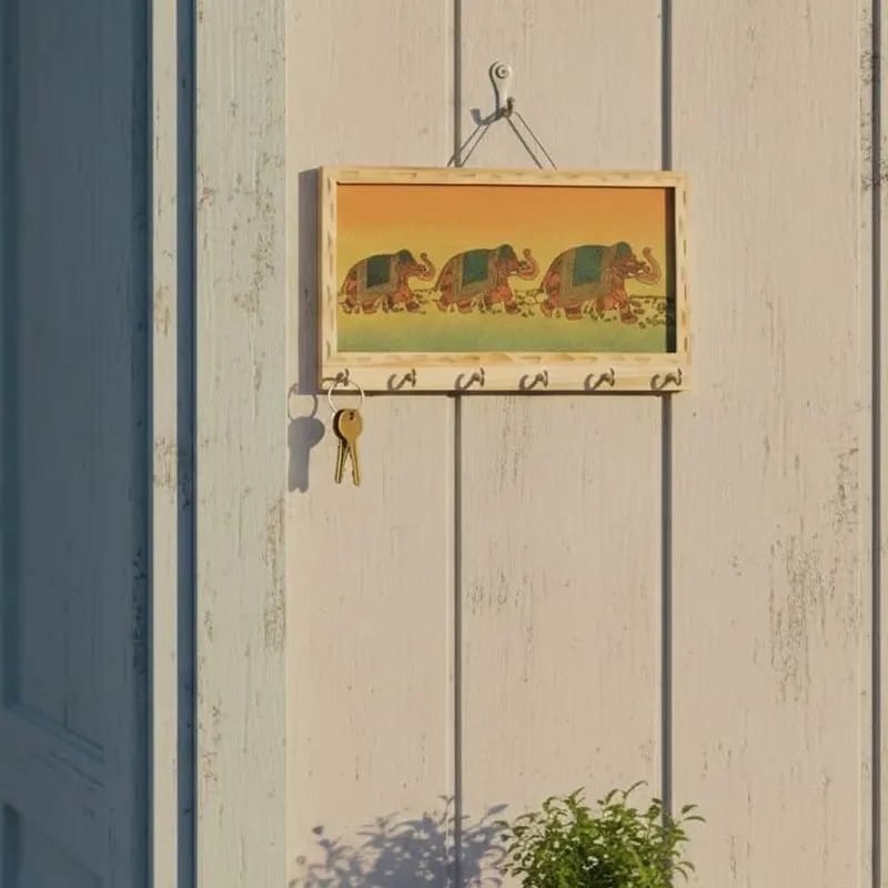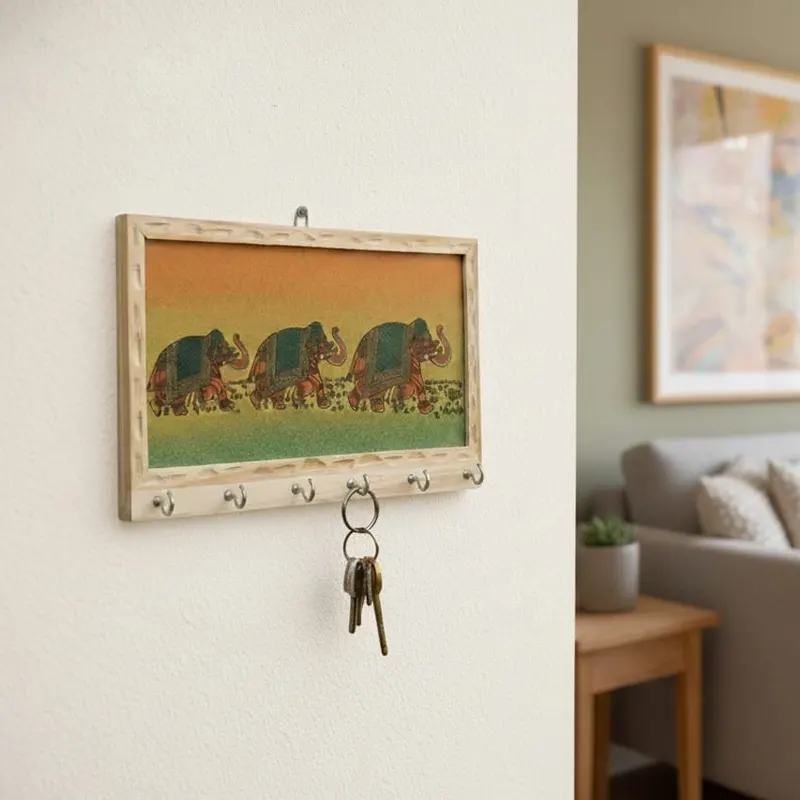 - Handmade Indian Elephant Key Holder made from durable Sheesham wood with a glass front and gemstone panel. Sturdy and elegant, perfect for organizing keys in your kitchen, office, or entryway. Ideal gift for Diwali, birthdays, anniversaries, weddings, and housewarming.