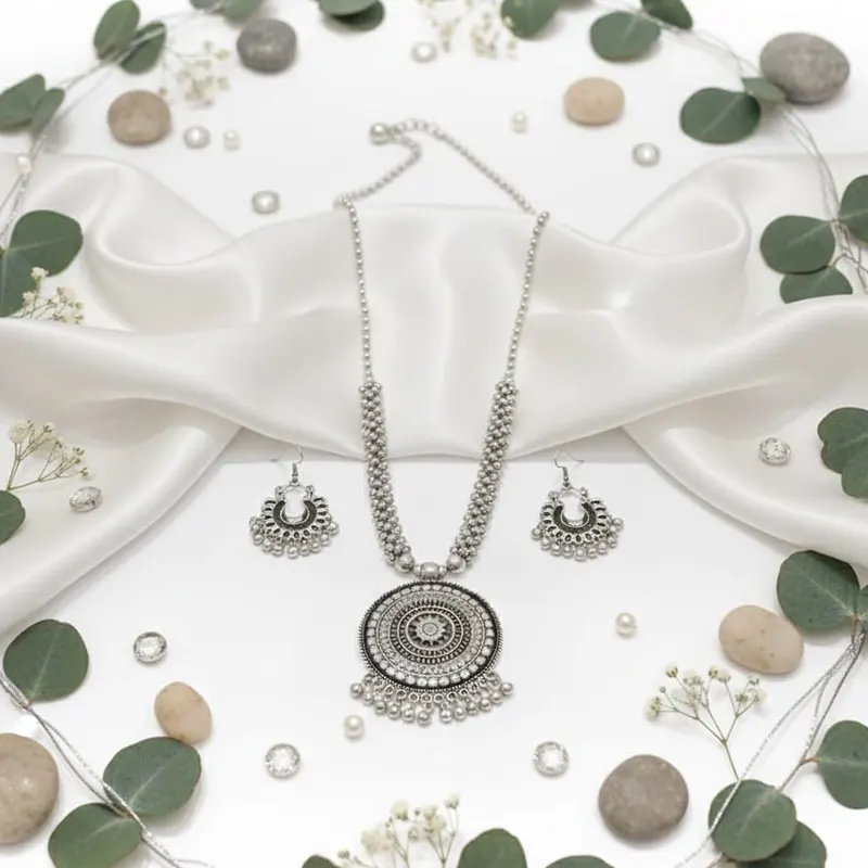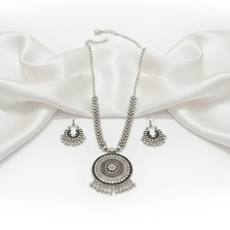 Handcrafted oxidised silver plated German silver necklace set with earrings, blending modern and ethnic style. Anti-allergy, premium quality, perfect for festive wear or gifting on special occasions.