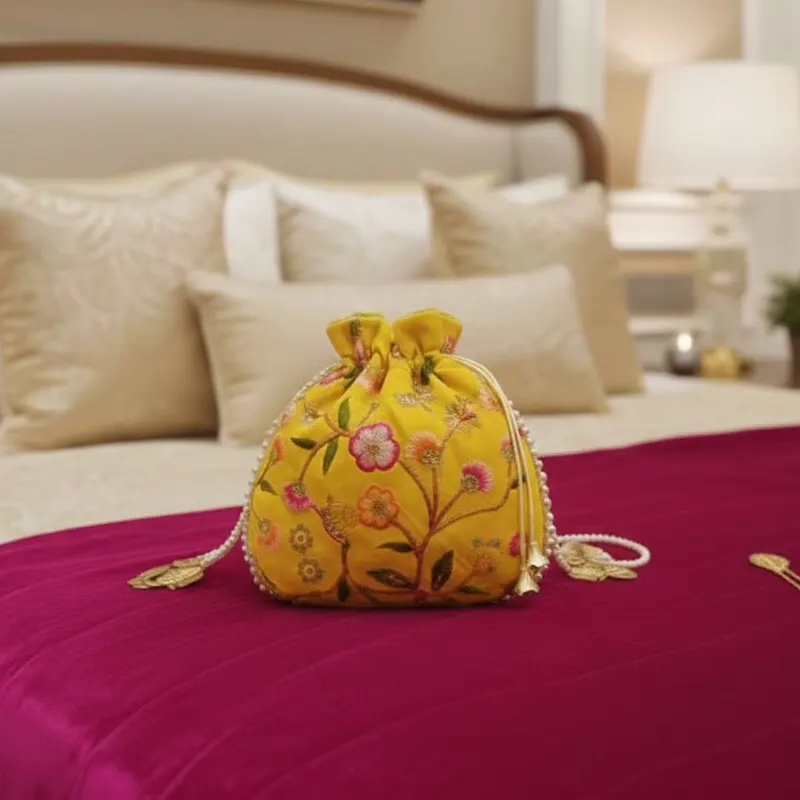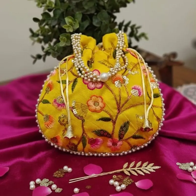 - Raw silk handmade combination of hand embroidery sequin work .The floral patterns are created using multi colored thread embroider and the bag embellished pearl work on sides of the potli . Use- used as a stylish accessory to compliment traditional outfits for events like weddings,festivals & parties they are frequently used to hold small gifts,jewellery, or other precious items & also used as return gifts filled with items like sweets,dry fruits or trinkets. Tradionally they were used to store coins,flowers or religious items.