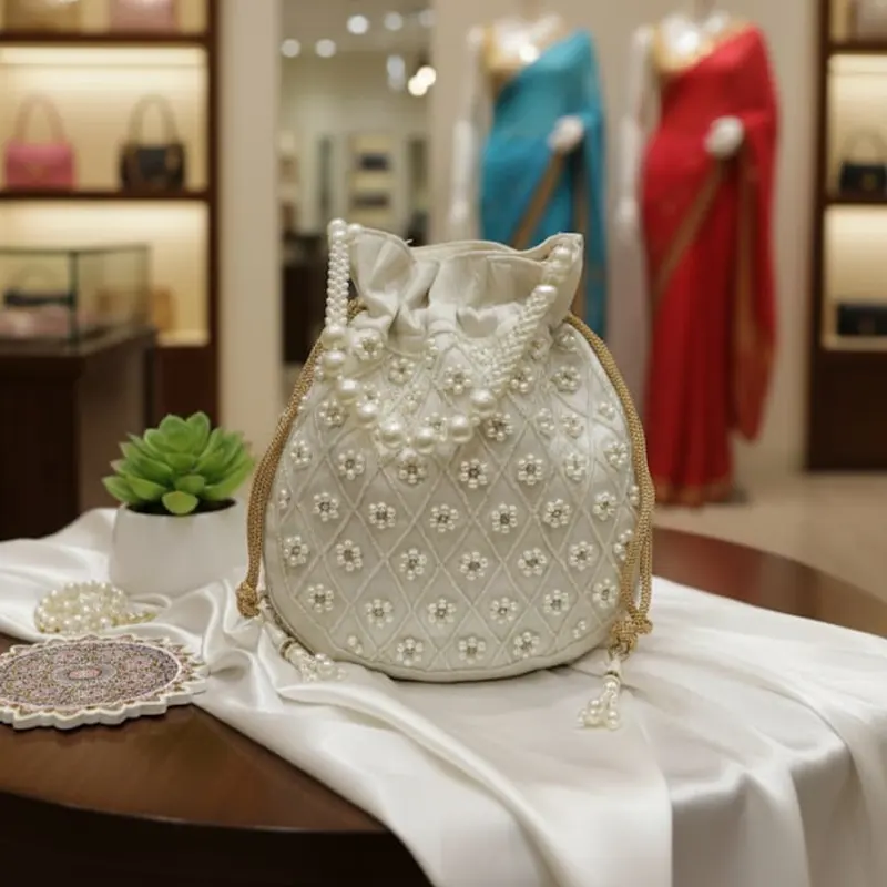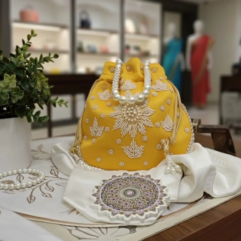 Be the first to review “Raw Silk Hand Embroidered Pearl Potli With Pearl String -Multicolor”
