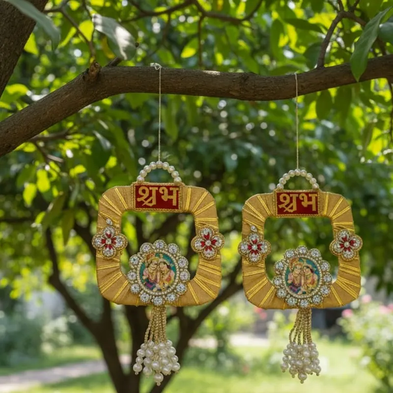 - Beautiful Shubh Labh decorative piece featuring hand-crafted gota work, white and red stone detailing, and a pearl holder with Radha-Krishna artwork. Adorned with dangling pearls for an elegant traditional look.