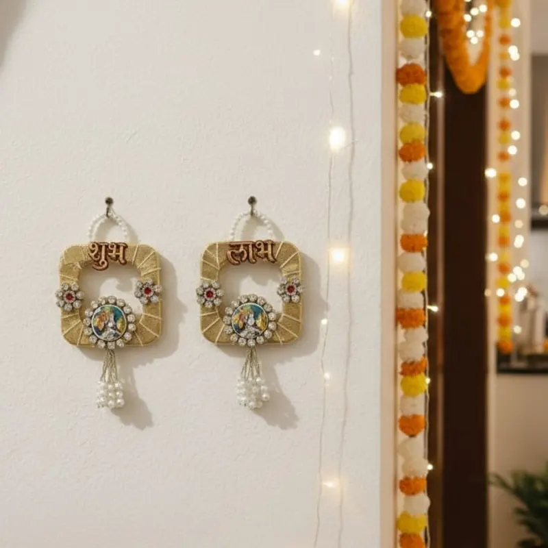 Shubh labh with hand gota and white and red stone work with pearl holder with radha-krishanji on it with pearls hanging .Used on festival house warming ceremony,diwali ,naming ceremony of a baby and welcoming of a baby.