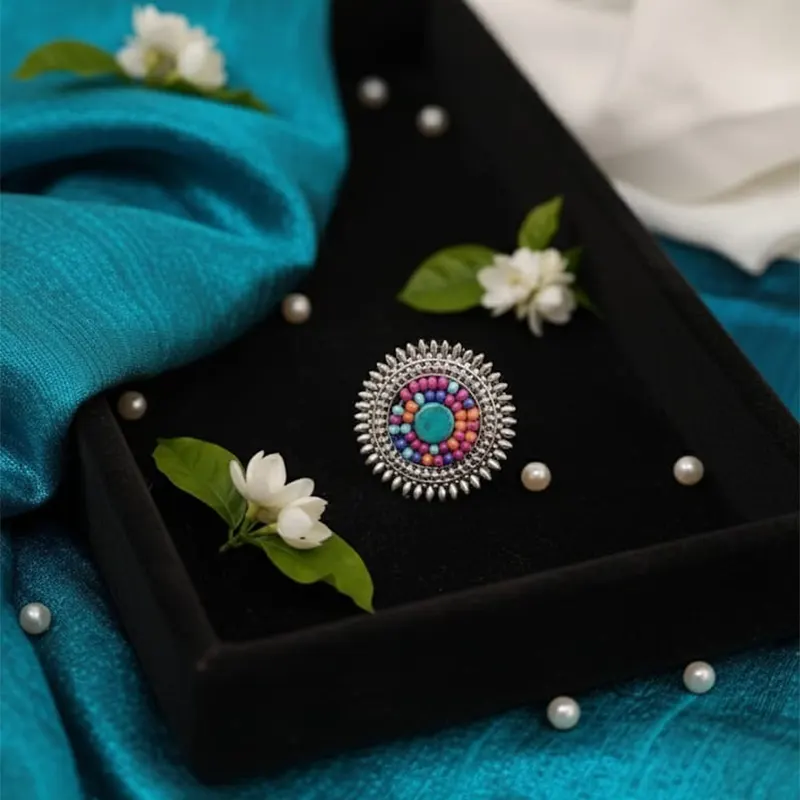 Silver Plated Oxidised Ring With Colored