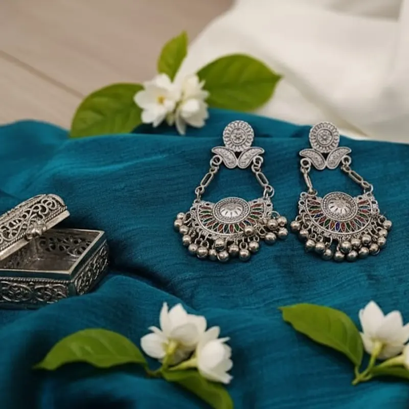 - Style: The earrings shown are silver-toned and incorporate small decorative beads, sometimes referred to as ‘ghungroos’.often worn with traditional Indian attire like sarees and lehengas, though modern styles can be paired with contemporary outfits as well.