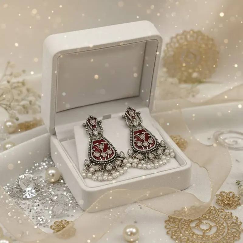 Its an indian designer oxidized silver earrings with red enamel work and pearl drops. They are also sometimes referred to by specific brand names or generic descriptions across various retailers.