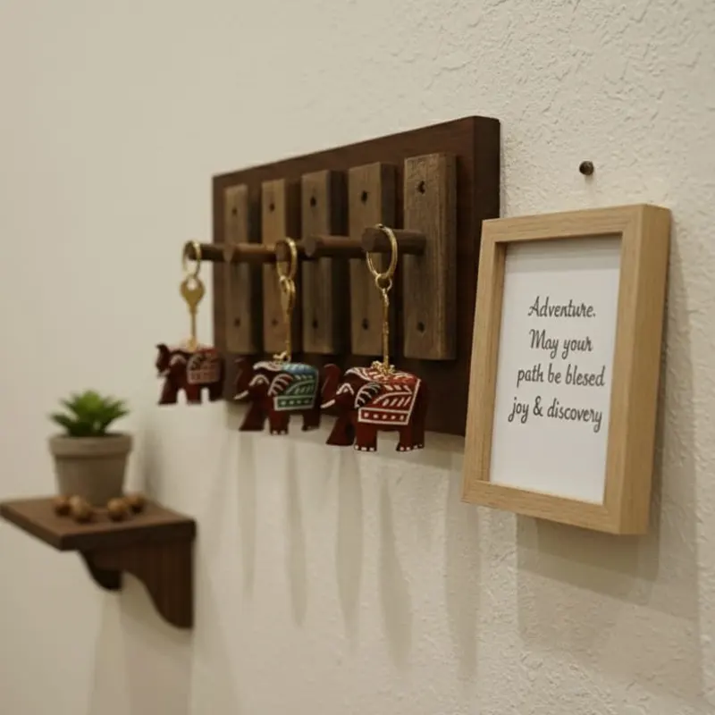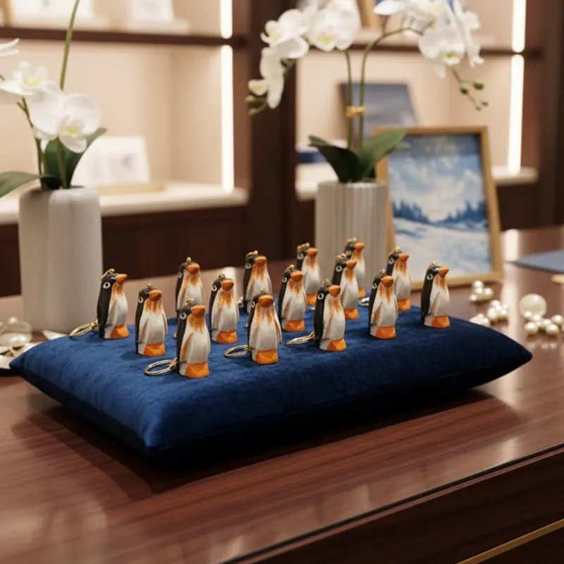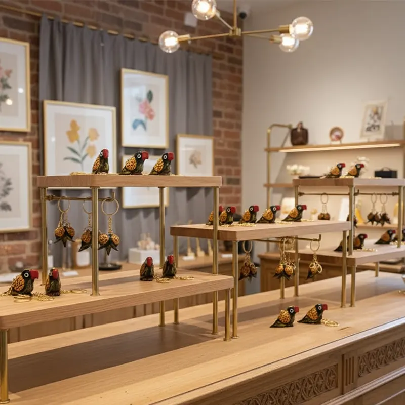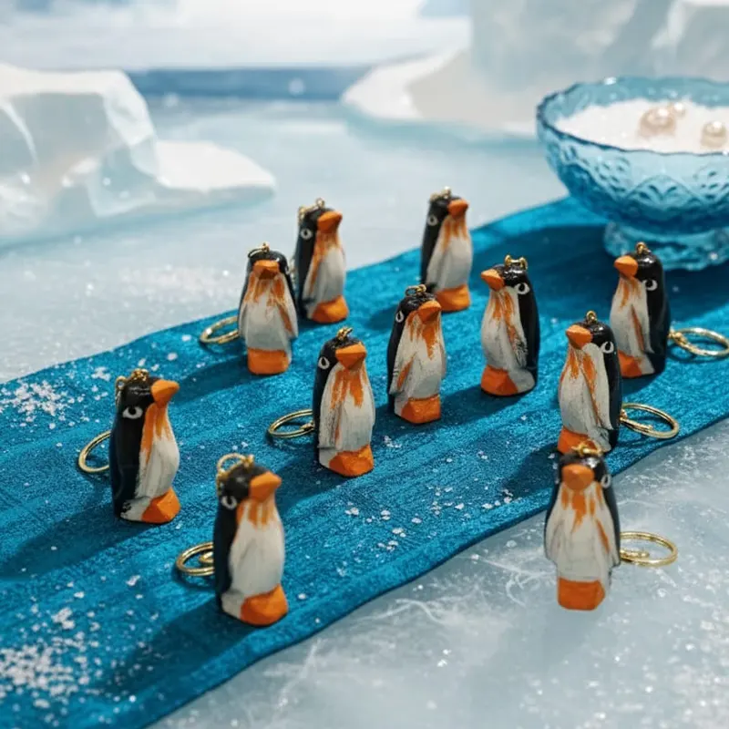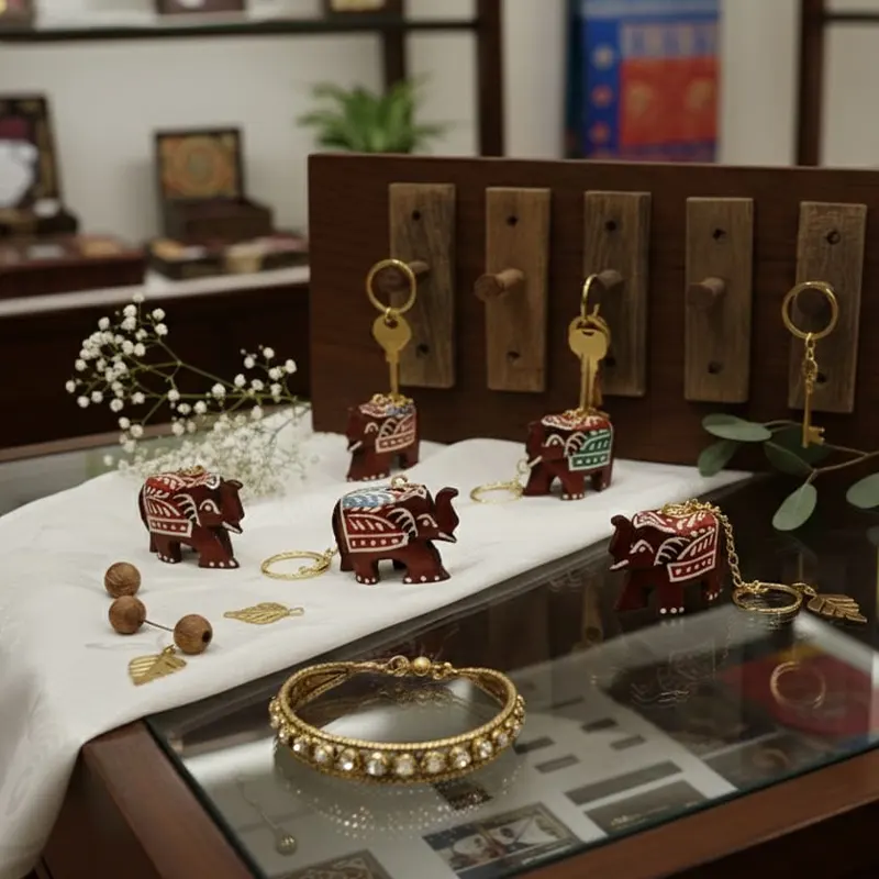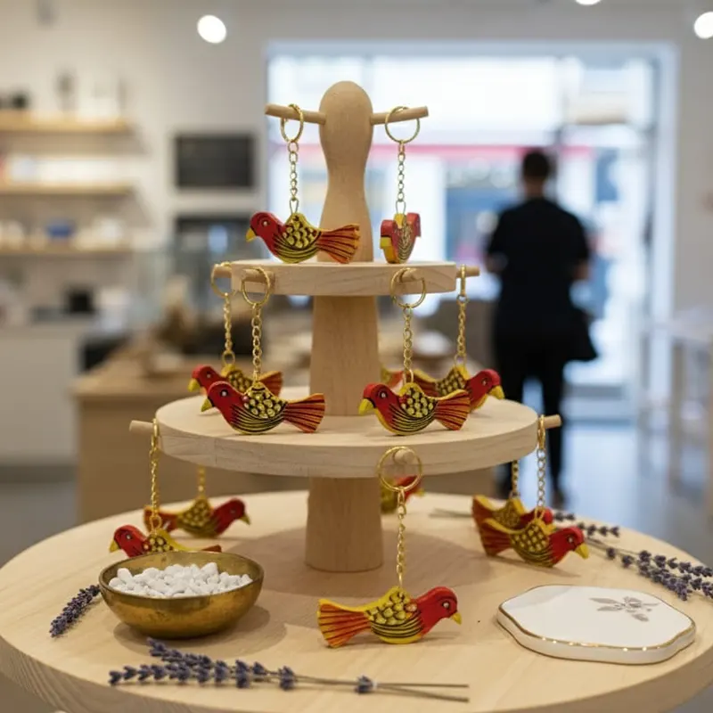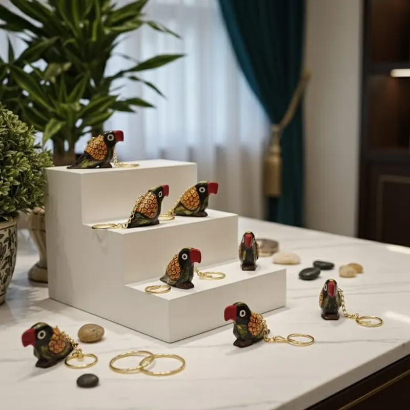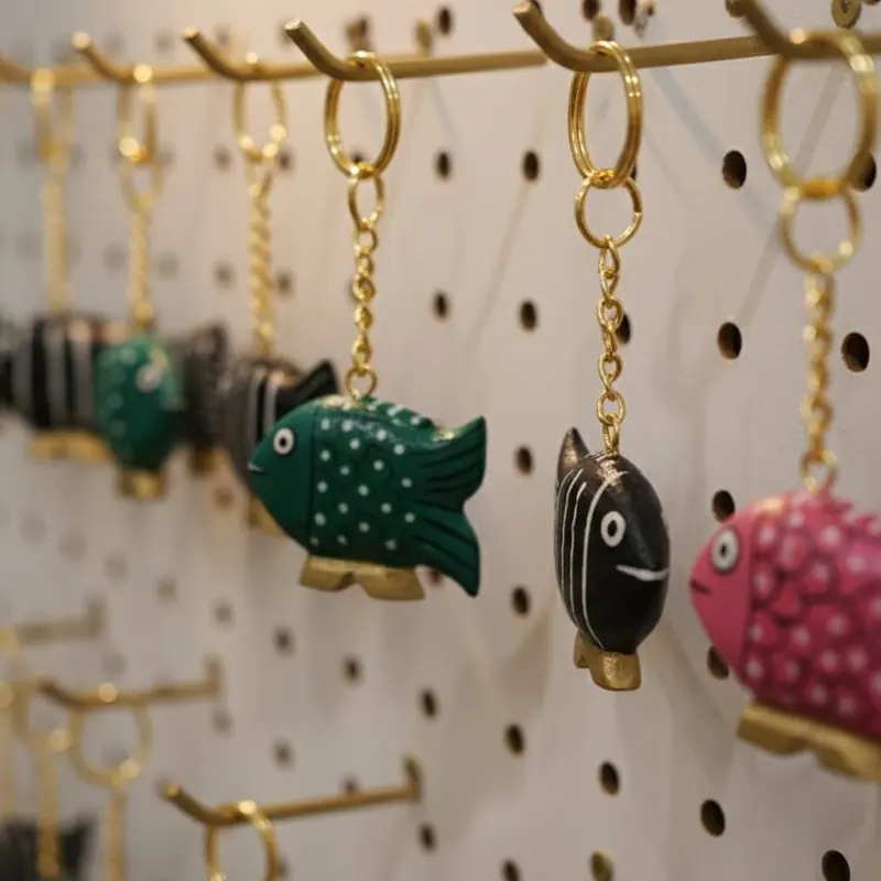Hand-carved, hand painted wooden birds, penguins, elephants, parrot, fish. Used as decorative keyrings, return gifts for events or travel souvenirs.